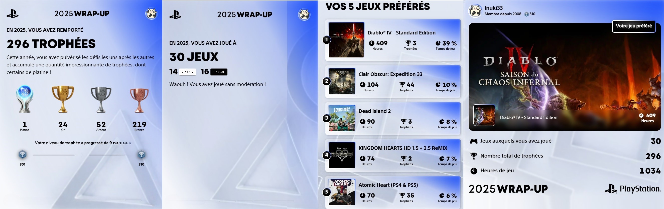 Steam et le PSN (PlayStation Network) ont depuis quelques années pris l'habitude de résumer l'activité des joueurs, en leur proposant une rétrospective individuelle qui met à l'honneur les jeux auxquels ils ont joué. De façon ludique, ces évènements offrent la possibilité de partager les coups de coeur, et proposent même des analyses du comportement des joueurs. Si les sites ne gardent pas longtemps ces rétrospectives, ils résument l'essentiel en une image que chacun est libre de partager autour de soi, ce qui peut donner des idées de nouveaux jeux aux autres. Dans cet esprit de partage, chacun est ici libre de montrer le résumé de son activité de joueur, tant sur Steam que sur le PSN. Et s'il y a d'autres sites qui le permettent aussi, ne pas hésiter à les partager ici !