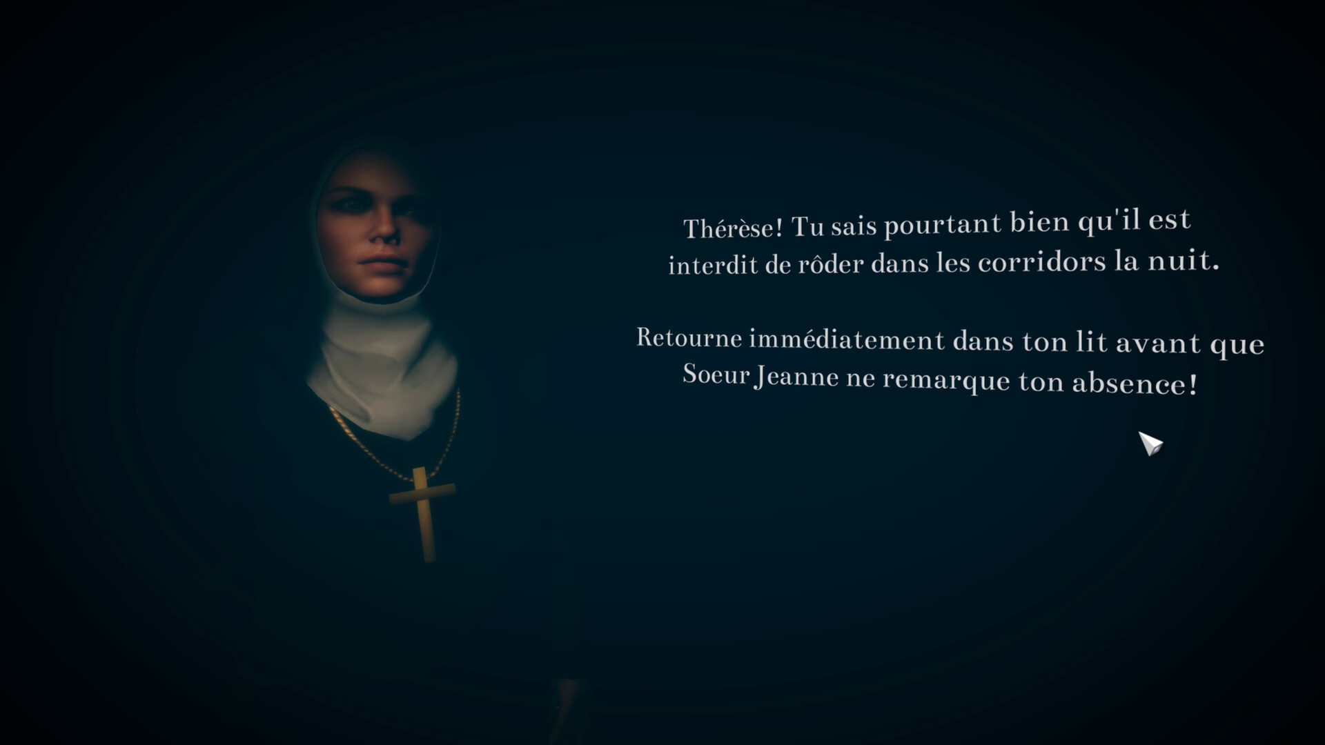 Vous incarnez Thérèse pour voyager entre deux mondes, celui d’un orphelinat sinistre et celui des rêves, dans le but de découvrir les origines des maux qui affligent les orphelins, le sombre héritage du clergé catholique au Québec. Vous explorerez ces deux univers et percerez leurs mystères en résolvant des énigmes, réalistes ou surréalistes, sollicitant votre sens de l’observation et de la déduction.* Jeu intégralement en français